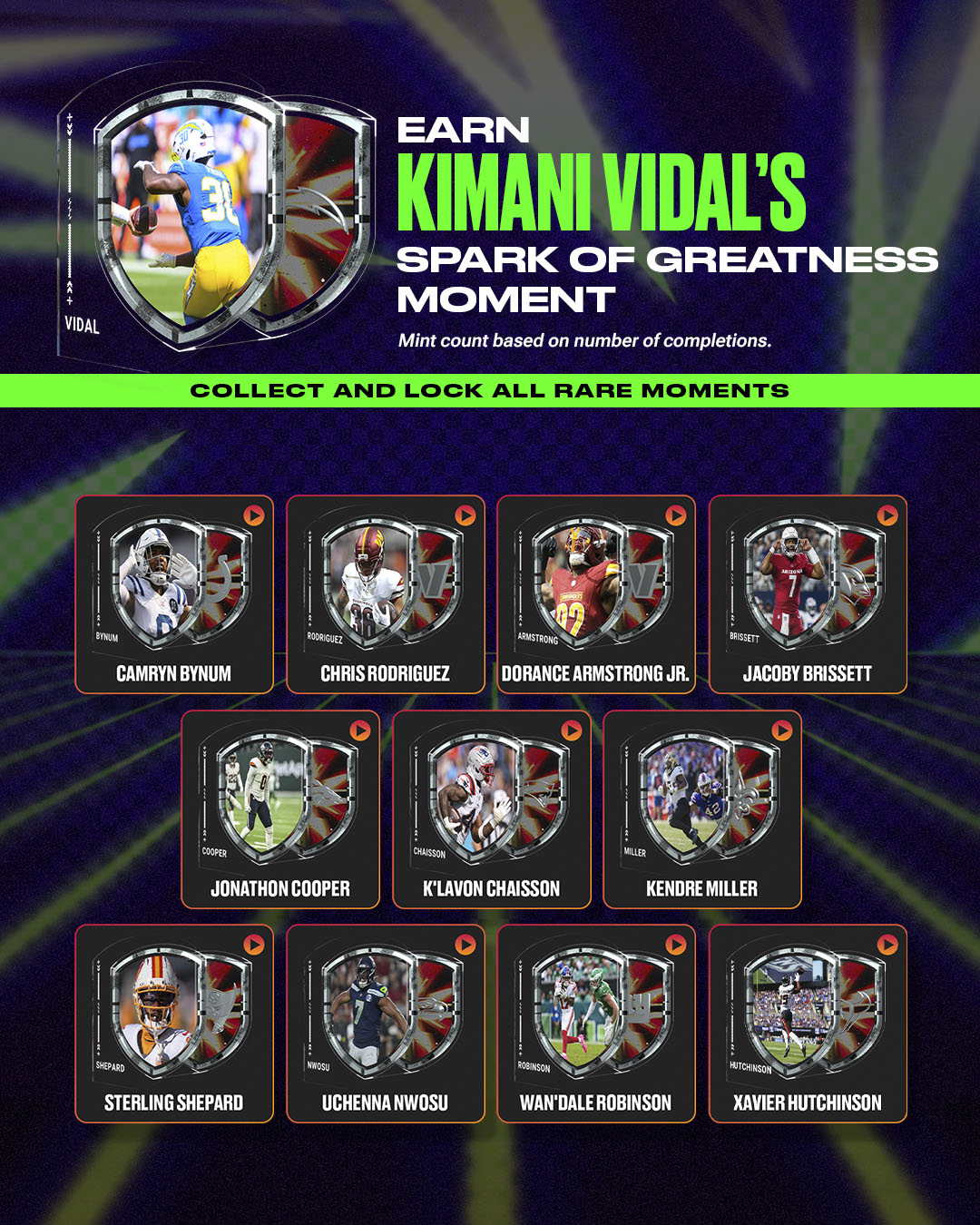 Lock your eligible Moments this week to earn the first Rare Moment of breakout Chargers running back Kimani Vidal.